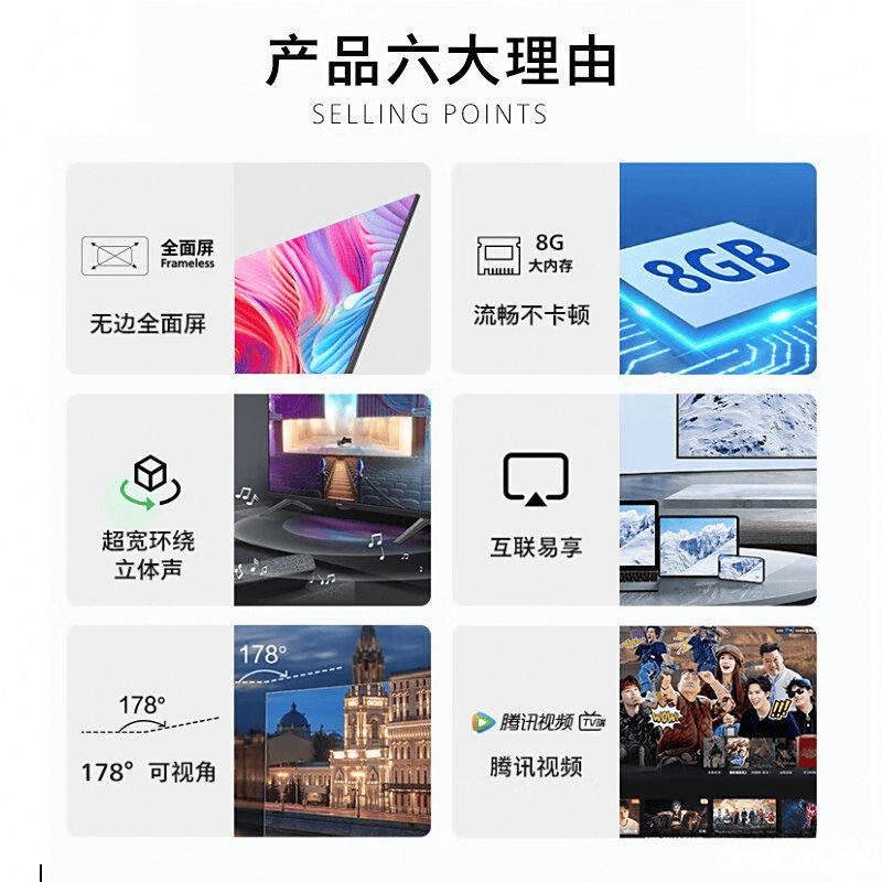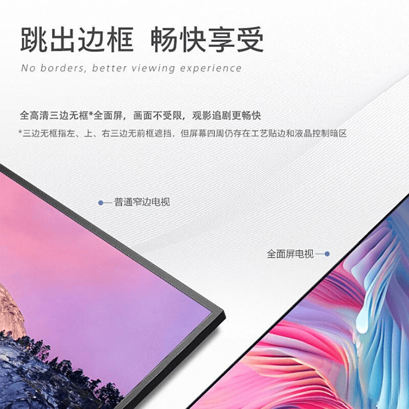 独特的无边框设计能够为用户提供更开阔的视觉享受,轻松营造沉浸式观影体验。不论从哪个角度观看,清晰的画面都让人仿佛置身于电影中。